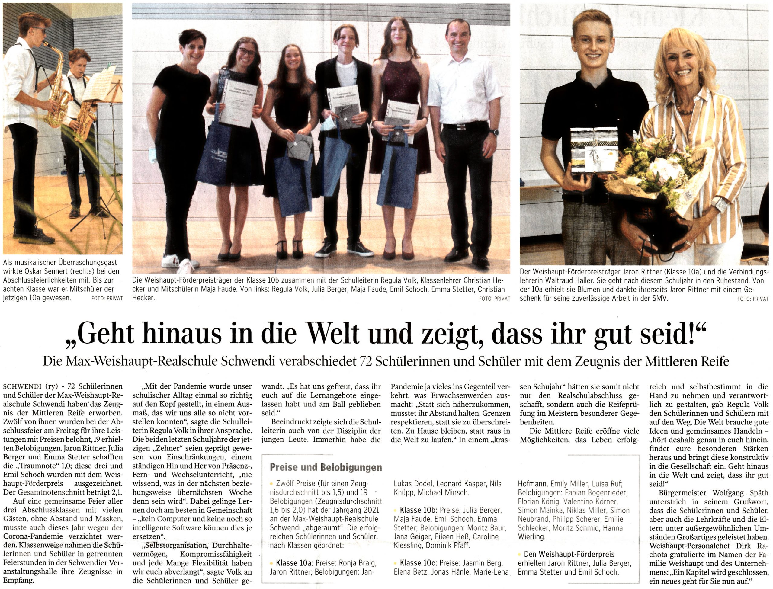72 Schülerinnen und Schüler erhalten Zeugnis der Mittleren Reife von hauptmann · 26. Juli 2021 72 Schülerinnen und Schüler unserer Schule haben am vergangenen Freitag das Zeugnis der Mittleren Reife erhalten. Dabei gab es 12 Preise und 19 Belobigungen, der Gesamtnotendurchschnitt beträgt 2,1. Beitrag in der Schwäbischen Zeitung (26.7.2021) Über den Autor hauptmann See author's posts