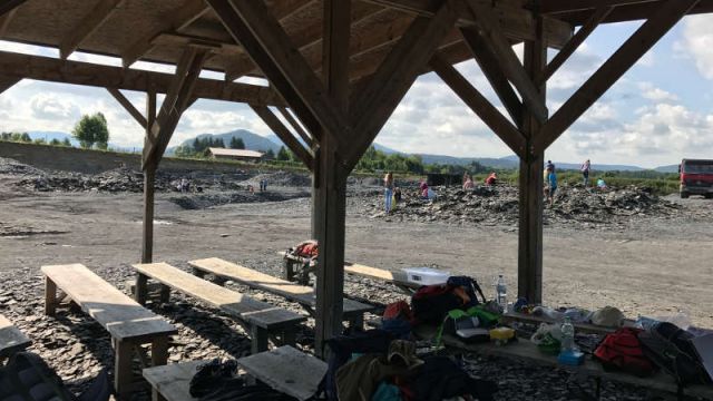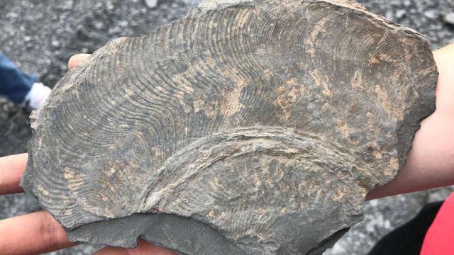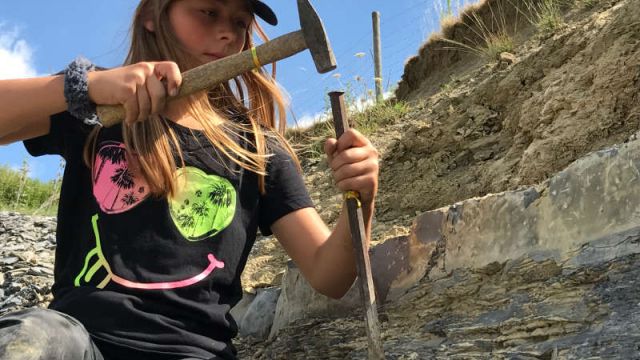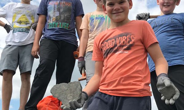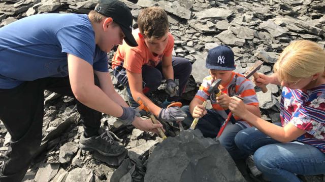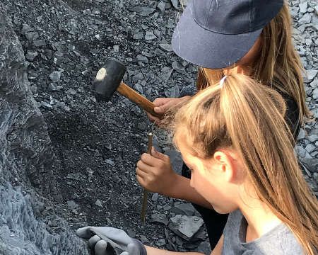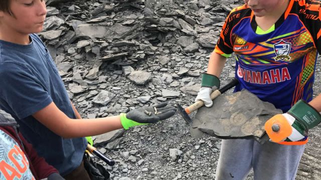 Da vormittags noch keine drückende Hitze herrschte, gingen die Schüler/innen, in Begleitung ihrer Klassenlehrerin Frau Jungblut und ihrer Biologielehrerin Frau Mayr, zuerst in den Schieferbruch Kromer bei Ohmden und lernten dort die unteren Schichten der Schwäbischen Alb in direktem Kontakt kennen. Mit Hammer und Meißel wurden die Schieferplatten gespalten und viele tolle Funde gemacht. Alle waren mit großem Eifer bei der Sache und freuten sich über versteinerte Ammoniten, Belemniten und “Katzengold”.
