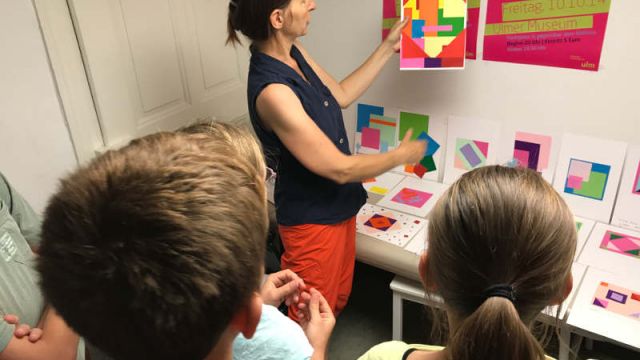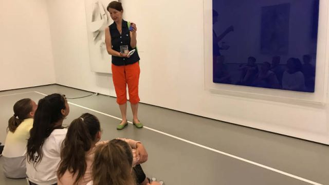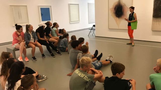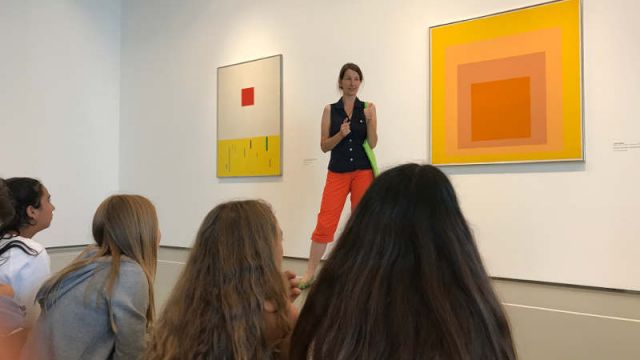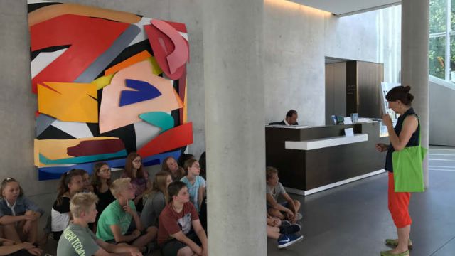 Kunstpädagogin Christine Söffing begrüßte die Kl. 7c vor einem Werk von Tom Wesselmann (Pacific Peach, 2000,Öl auf ausgeschnittenem Aluminium) in der Eingangshalle. Mit viel Gespür führte Sie die Schüler in einige Werke der Konkreten Kunst ein. Die Werke Homage to the Square – Summer noon, 1964 von Josef Albers und Komposition Nr. 210, 1958 von Friedrich Vordemberge-Gildewart stellte Frau Söffing in den Mittelpunkt. Erstaunen weckten die Geheimnisse der Farbkompositionen und die Gesetze der geometrischen Aufteilung beider Werke.