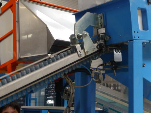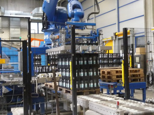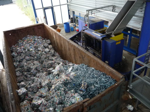 Der Industrie-Roboter leert auch das angelieferte Leergut. Die Kunststoffflaschen werden gepresst (rechts im Bild) und paketweise in den Recycling-Container geworfen. Ebenso die anfallende Ausschussware. Ein Betrieb in Bayern arbeitet diesen „Wertstoff“ wieder auf, so dass daraus neue Flaschenrohlinge gefertigt werden können. Zu 50% altem Material werden 50% neues Granulat dazugemischt (erkennbar an dem acht-eckigen Flaschenhalsende). Lukrativer (gewinnbringender) wäre es den Abfall nach China zu verkaufen, wo er Monate später bei uns z.B. wieder als Kunststoff-Pullover auf den Markt käme. |