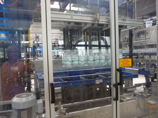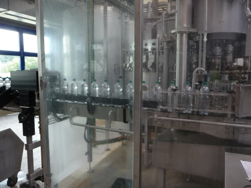 Durch die Wärme wird der Kunststoff dehnbar und in einem speziellen „Werkzeug“ unter sehr hohem Druck (12 bar) zur Flaschenform aufgeblasen.Über Luftdruck werden die fertigen Flaschen zur Waschanlage weitertransportiert. Durch ein spezielles Verfahren wird dabei verhindert, dass Keime in die Flaschen gelangen. |