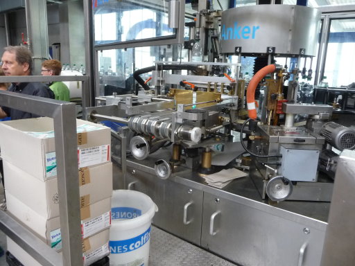 In dieser Maschine werden die Etiketten aufgeklebt.Anschließend wird mit einem Laser das Haltbarkeitsdatum in den Flaschenhals eingraviert. |
