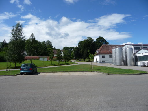 Unter dem kleinen Häuschen (links) befindet sich die Lazarus-Quelle in ca. 100 m Tiefe. Das Wasser läuft durch verschiedene Tonschichten und wird so auf natürliche Art gefiltert. Das Wasser braucht ca. 5.500 Jahre bis es in 100 m Tiefe im Kiesbett ankommt. Nur 1/3 der Wassermenge darf entnommen werden. Das sind 4 Liter pro Sekunde. Der Tagesbedarf wird nachts in die vier silbernen Tanks gepumpt und dort gespeichert. Ein Tank fasst 50.000 Liter. |