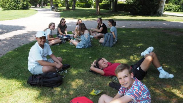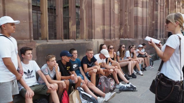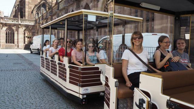 Wir starteten mit einem Spaziergang zur Kathedrale, die wir später auch besichtigten. Die angenehmen Temperaturen in der beeindruckenden Kirche waren eine Wohltat, denn draußen herrschten fast 40 Grad! Nach der Stadtrundfahrt im „petit train“ suchten dann auch manche von uns die Ill auf und ließen ihre Füße im erfrischenden Wasser des Flusses baumeln. Abends aßen wir gemeinsam Flammkuchen, ein Muss im Elsass! Natürlich bestellten wir auf Französisch – eine der Sprachaufgaben, die es während der Fahrt zu bewältigen gab.