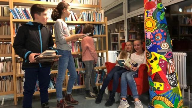 Die Bücherei→ war natürlich besonders gut besucht, hier gab Frau Wegmann wertvolle Buchtipps und die Mädchen und Jungen konnten in Ruhe viele verschiedene Bücher (an-)lesen.