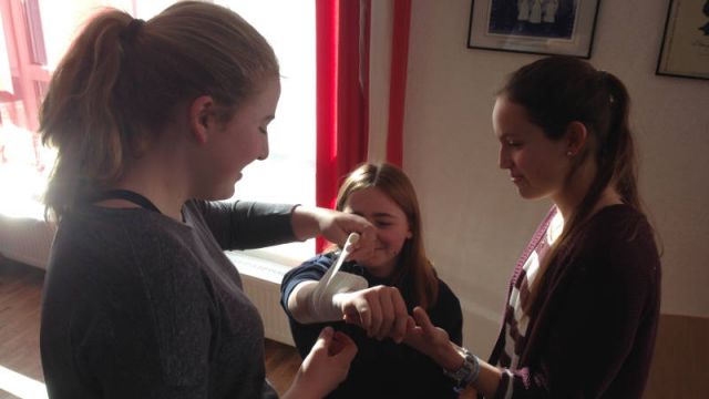 Im Rahmen einer Erste-Hilfe-Ausbildung am 06. Februar 2020 wurden 15 Schülerinnen und Schüler aus der Jahrgangsstufe 8 auf den Schulsanitätsdienst vorbereitet. An zahlreichen praktischen Übungsszenarien erlernten die Jugendlichen unter anderem den richtigen Umgang mit dem Patienten, eine adäquate Wundversorgung, Maßnahmen bei vital bedrohten Personen oder die Herz-Lungen-Wiederbelebung. Diese Basiskompetenzen, ergänzt durch weitere Bausteine in den Übungsstunden, liefern den neuen Schulsanis nach den Osterferien die nötige Sicherheit für kleinere und größere Einsätze während des Schulbetriebes. In den kommenden Wochen schnuppern die neuen Schulsanis als Praktikanten bei den Neuntklässlern in den Schulsanitätsalltag hinein.