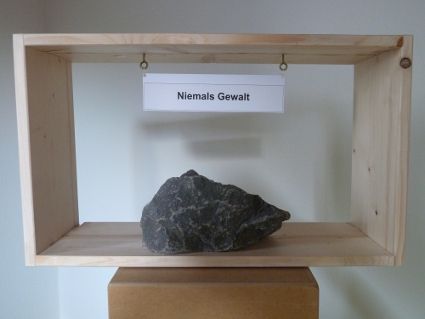 Da aber fing auch die Mutter an zu weinen, denn plötzlich sah sie alles mit den Augen des Kindes. Das Kind muss gedacht haben: “Meine Mutter will mir wirklich weh tun, und das kann sie ja auch mit einem Stein.” Sie nahm ihren kleinen Sohn in die Arme, und beide weinten eine Weile gemeinsam. Dann legte sie den Stein auf ein Bord in der Küche, und dort blieb er liegen als ständige Mahnung an das Versprechen, das sie sich in dieser Stunde selber gegeben hatte: “NIEMALS GEWALT!”