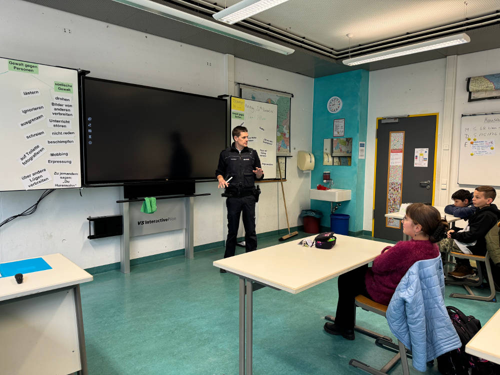 Die Klassen 6 beschäftigten sich mit dem Thema „Gewalt“. Dazu erklärte Herr Kolesch, was man alles unter dem Oberbegriff „Gewalt“ versteht. Körperliche Gewalt, seelische Gewalt oder eine Sachbeschädigung sind Dinge, die je nach Ausmaß auch strafrechtlich geahndet werden können. Es ging an diesem Vormittag auch über den Umgang miteinander in der Gemeinschaft. So lernten die 6. Klässler, was man unter dem Begriff „Cybermobbing“ versteht und wie sich ein Opfer fühlt, wenn es durch Medien „fertig gemacht“ wird. Herr Kolesch erzählte dazu auch einige Vorfälle, die er mitbekommen hat.