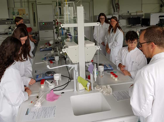 Neben der interessanten Laborarbeit informierte Herr Dr. Kugelmann unsere Neuntklässler auch über die entsprechenden Schul- und Berufsabschlüsse, welche nach der 10. Klasse in Laupheim angestrebt werden können. Zum einen können naturwissenschaftlich interessierte Schülerinnen und Schüler das zweijährige Berufskolleg CTA (chemisch-technischer Assistent) bzw. BTA (biologisch-technischer Assistent) wählen oder sie entscheiden sich für die Doppelqualifikation „Abi und Beruf in drei Jahren“. Dabei erlangen die Schülerinnen und Schüler in den drei Jahren neben der Allgemeinen Hochschulreife noch den Berufsabschluss „Umweltschutz-Technischer Assistent“ (UTA).