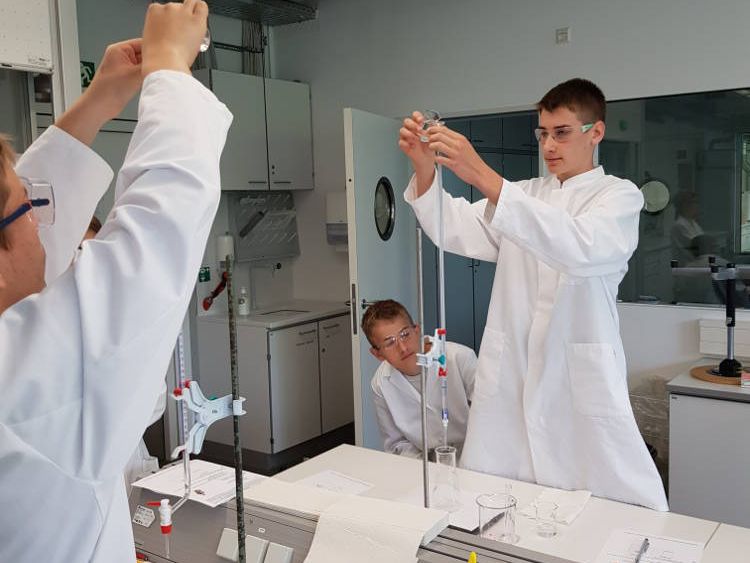 Der entsprechende Umgang mit der 25-ml-Bürette war dabei für die Schülerinnen und Schüler genauso interessant, wie beispielsweise das „Gummibärchen im flammenden Inferno“ – einem Demonstrationsversuch unter dem Abzug.